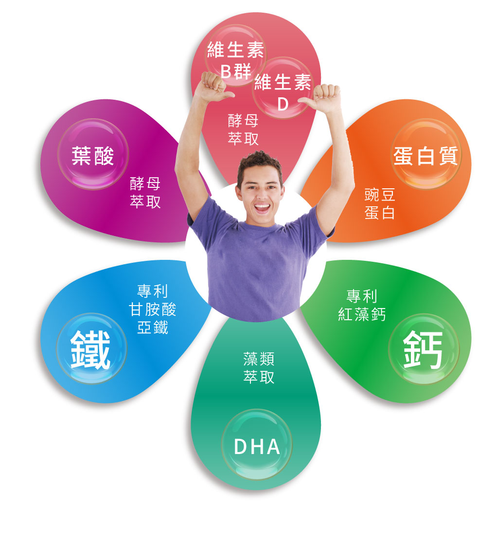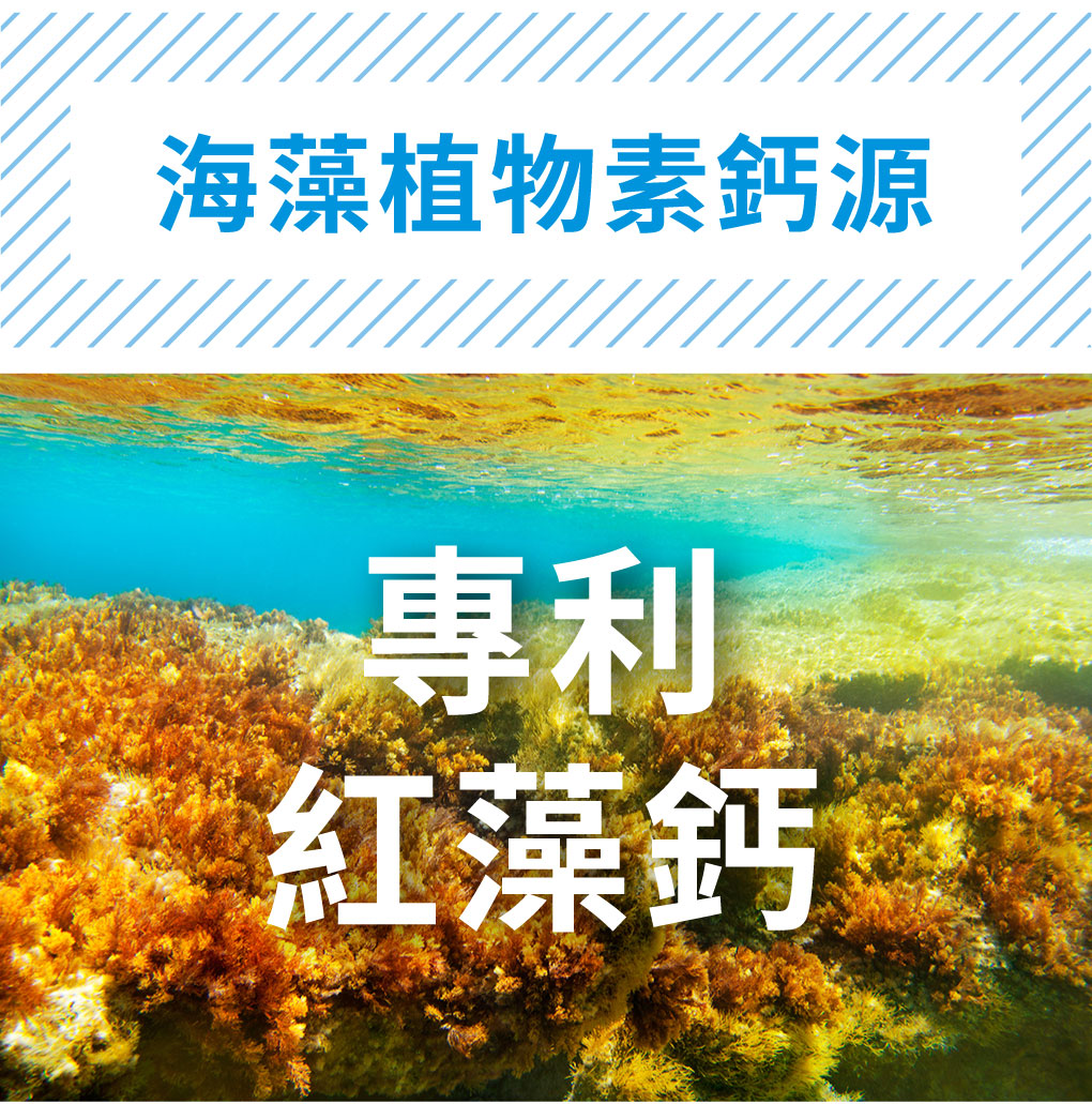 成 分:酵母發酵物、豌豆蛋白、紅藻鈣(專利)、甘胺酸亞鐵(專利)、藻類萃取(含DHA)